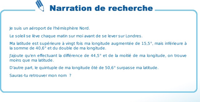 Exemple : Il est écrit "le quintuple de ma longitude ôté de 50,6 surpasse ma latitude". Cela donne l'inéquation 50,6-5x > y.
