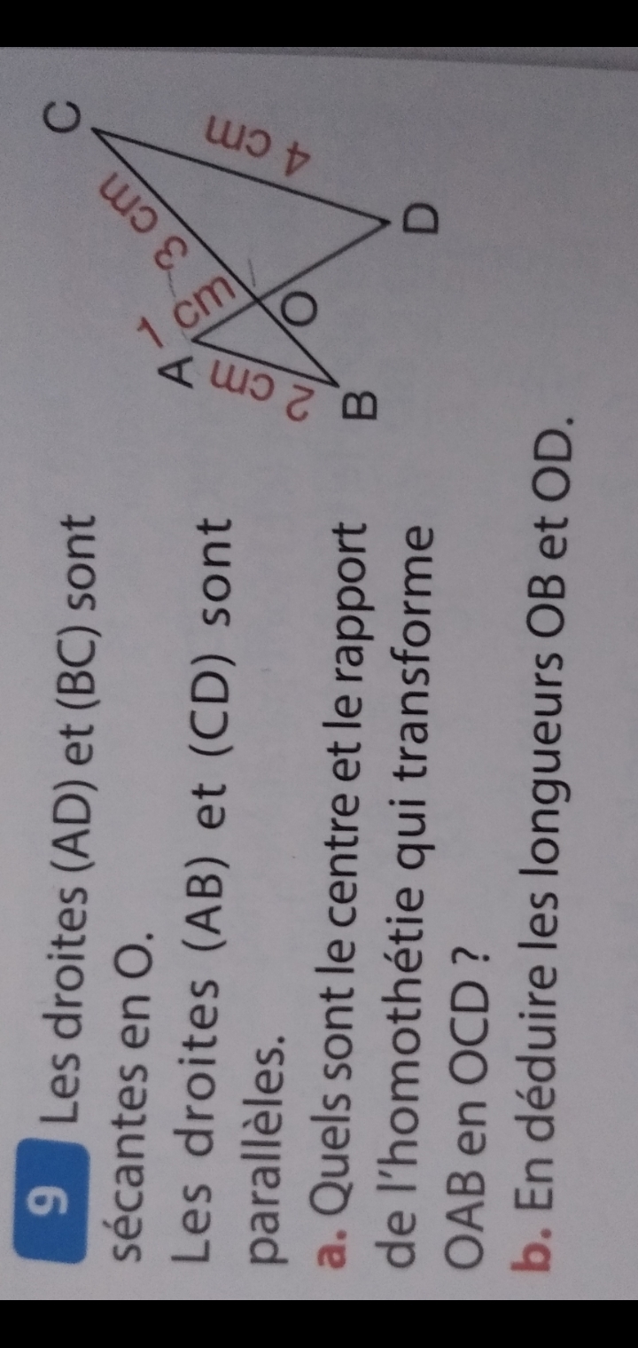 On a \(\dfrac{OC}{OB}=\dfrac{OD}{OA}=\dfrac{CD}{AB}=k\) où \(k\) est le rapport de l'homothétie transformant \(OAB\) en \(OCD\).