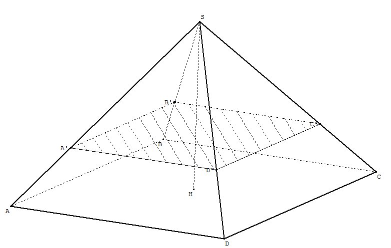 si tu traces un plan parallèle à la base carrée de la pyramide et qui coupe les arêtes de la pyramide on obtient une pyramide plus petite mais dont les mesures des arêtes sont proportionnelles à celles de la première pyramide