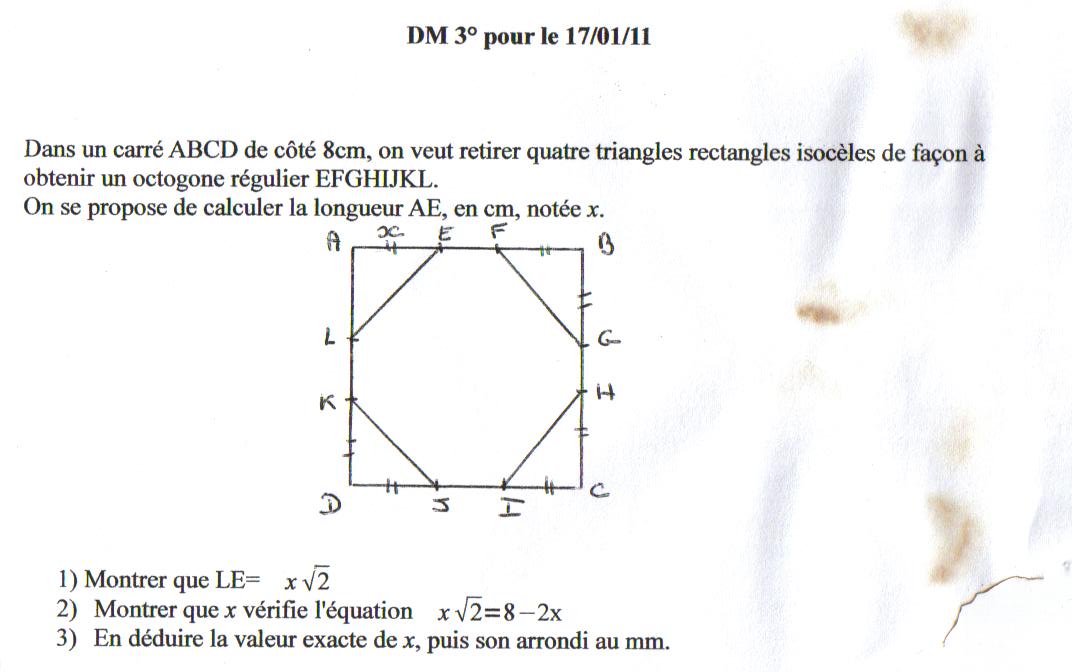 Ensuite Tu obtiens un octogone régulier si tous les côtés sont égaux donc LE = EF = FG = ....