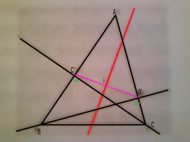 2. (BC') et (CC') se coupent en A, démontrer que l'intersection de (BB') et (CC') est l'othocentre du triangle ABC, puis tracer la troisième hauteur de ABC.