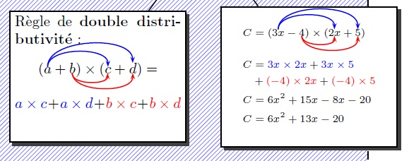 À partir de là pour développer une expression du type \((2x+3)(3x-5)\) on écrit que \((2x+3)(3x-5)=2x(3x-5)+3(3x-5)\) et on se ramène à deux développements du type de celui de la première ligne.