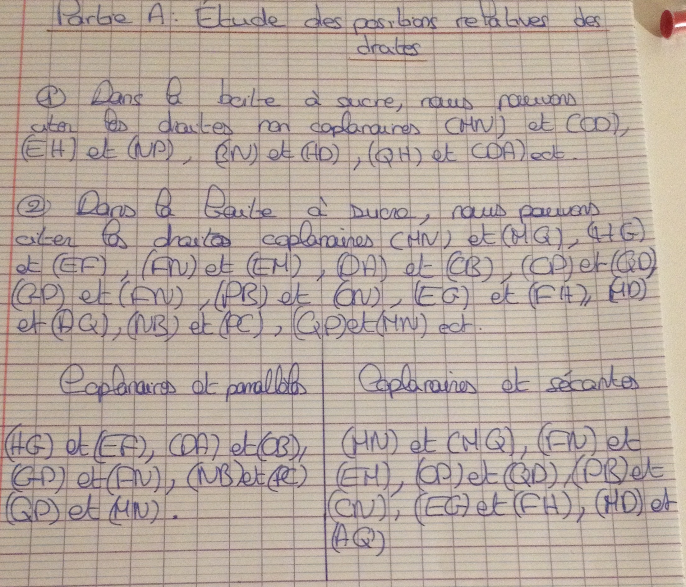 Pour la partie A question 1 j'ai trouvé les droites coplanaires (MN) (MQ) (QP) et (PN), je ne suis cependant pas sûr et je crois en avoir oublié ...