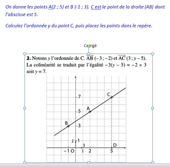De même \(\overrightarrow{AC}\left(\begin{array}{c}x_C-x_A\\y_C-y_A\end{array}\right)=\left(\begin{array}{c}5-2\\y-5\end{array}\right)=\left(\begin{array}{c}3\\y-5\end{array}\right)\)