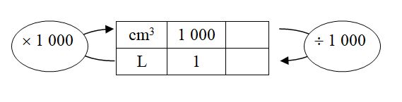 Ensuite si on a 1 000 cm\(^{3}\) = 1L, alors pour convertir des cm\(^{3}\) en litres il faut diviser par 1 000.