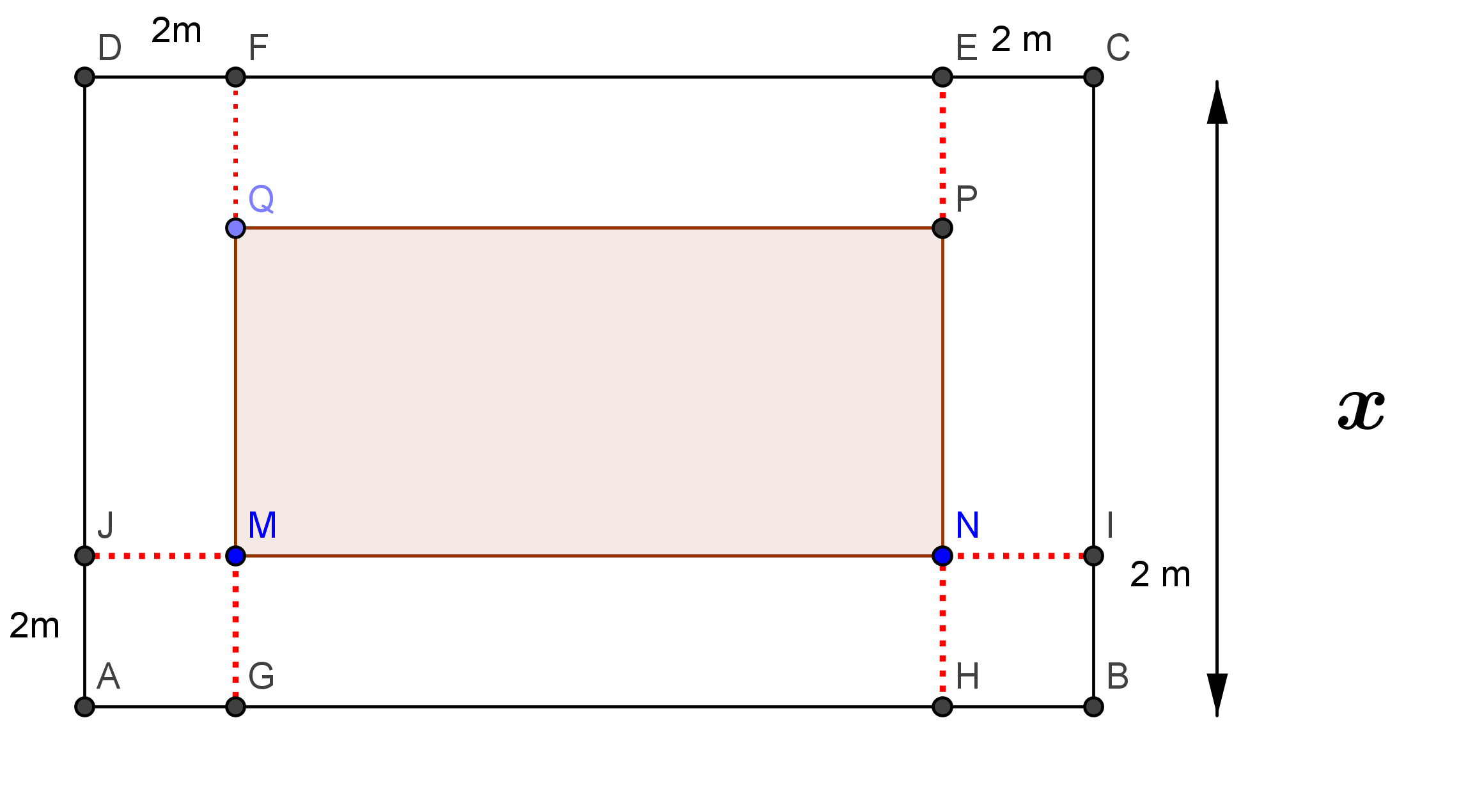 si on reprend l'exercice, on a la figure suivante : On désigne par \(x\) la largeur de la zone piscine+allée.Charlotte a écrit : Leon desire faire construire une piscine rectangulaire sur sa proprieté. Il s'impose les contraintes suivantes: