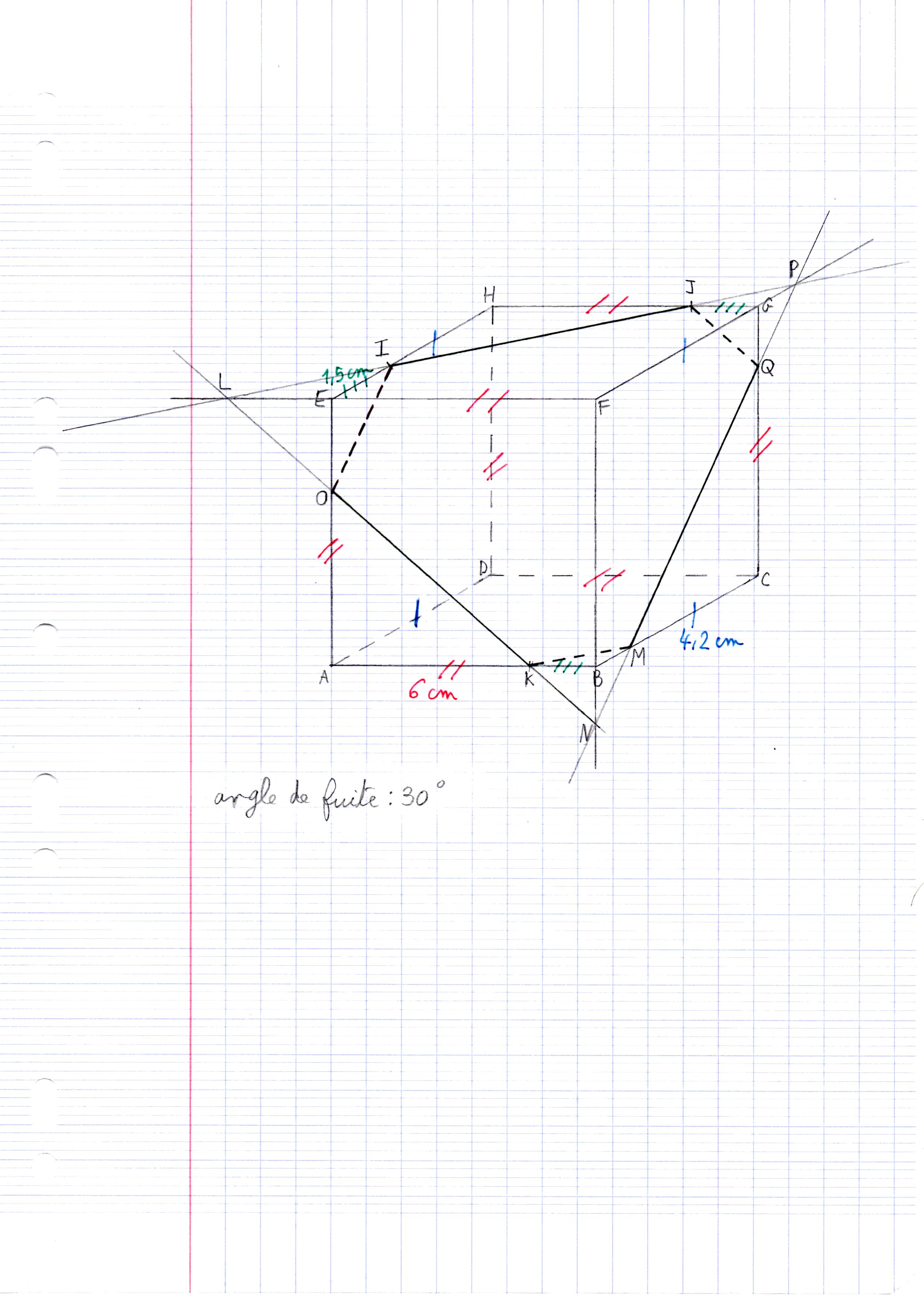 Bonjour, j'ai tracé la section plane I,O,K,M,Q et J en noir, je dois ensuite calculer le périmètre de cette section, pourriez avoir la noblesse et la gentillesse de m'aider. Moi personnellement je pense qu'il faut utiliser le théorème de Pythagore. S'il vous plaît, merci d'avance.