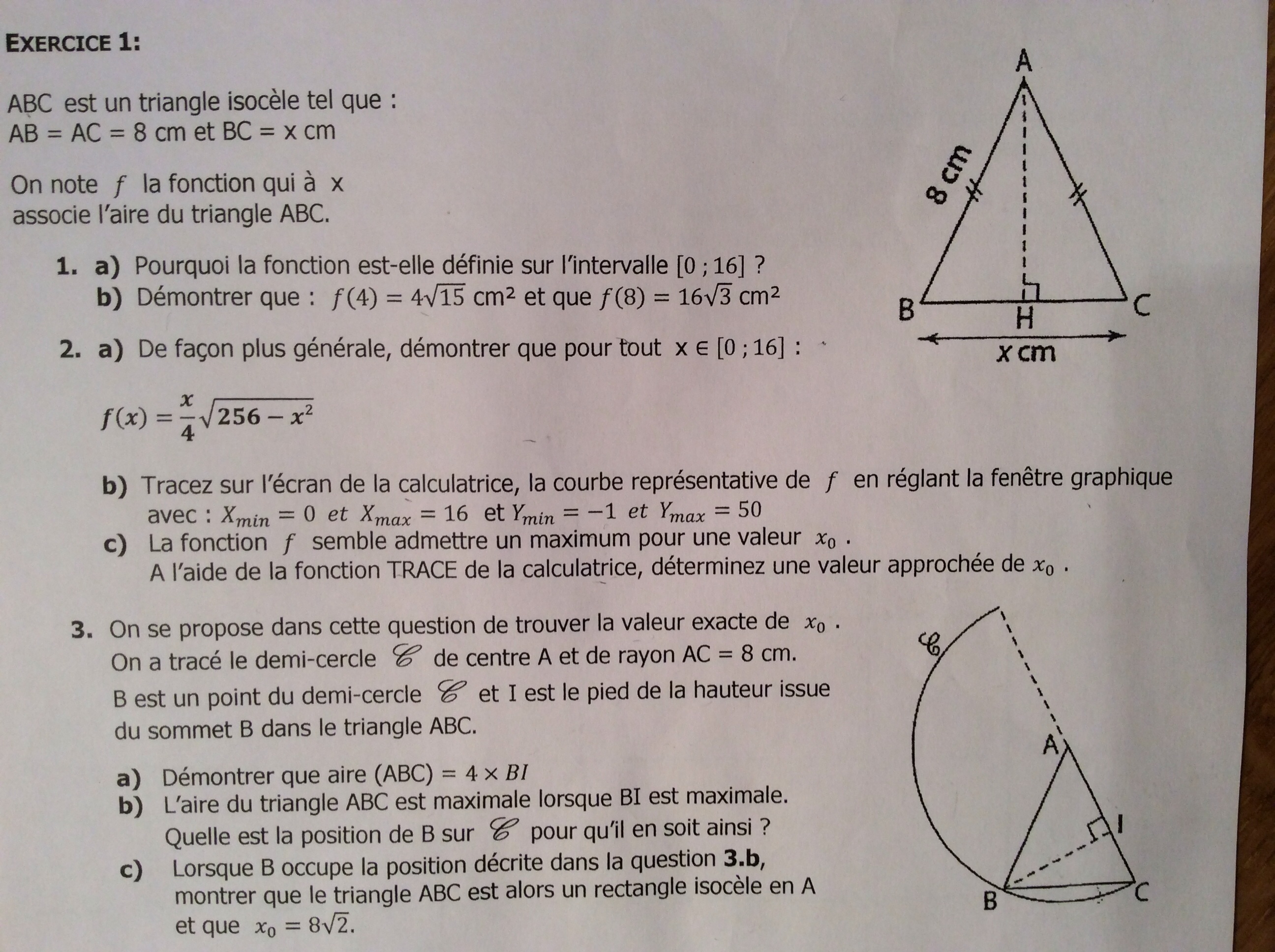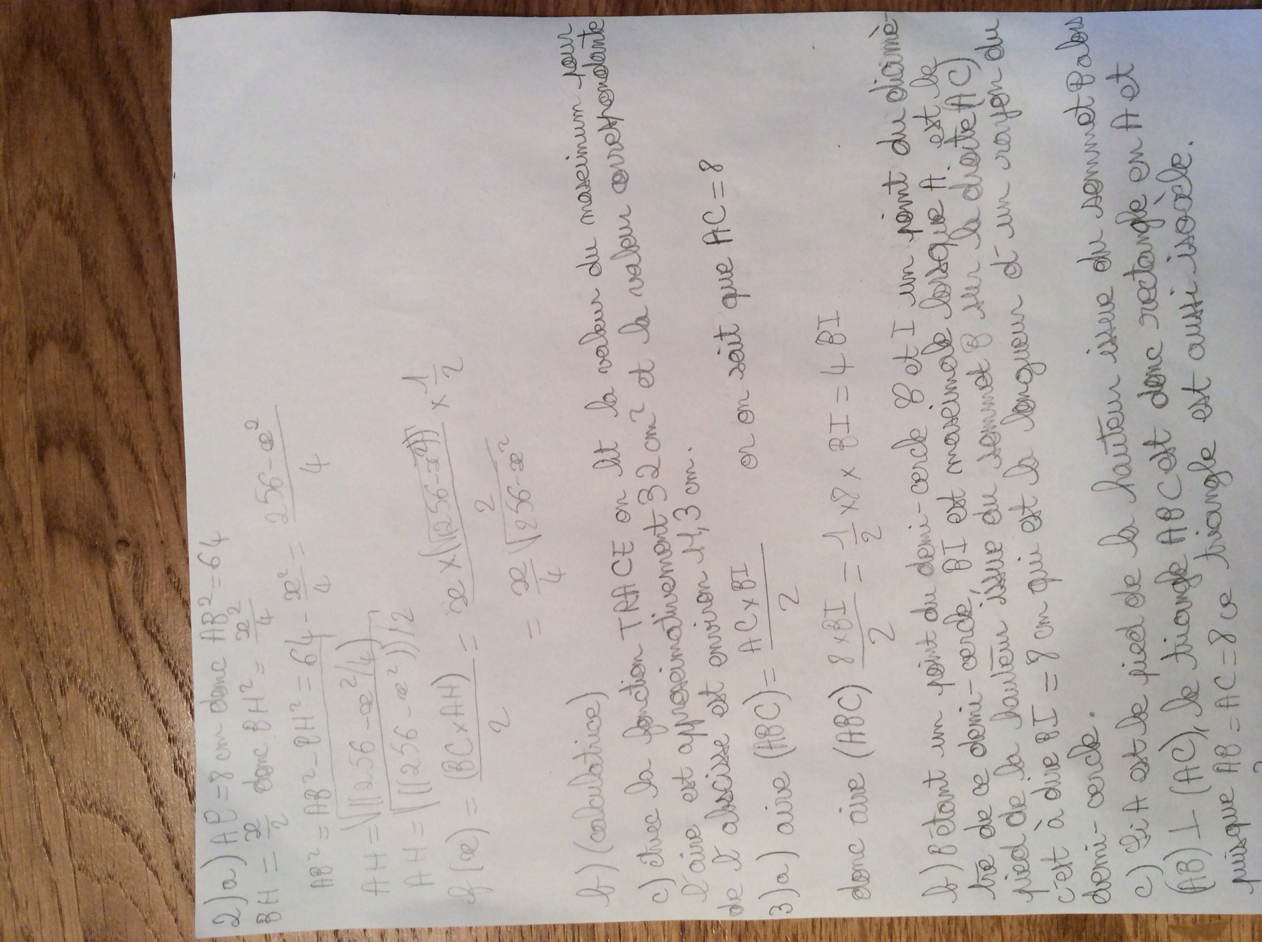 Pour la question 1)b) tu aurais du calculer l'aire pour les 2 valeurs de x proposées, plutot que de calculer le cas général et ensuite de donner à x les valeurs 4 et 8.