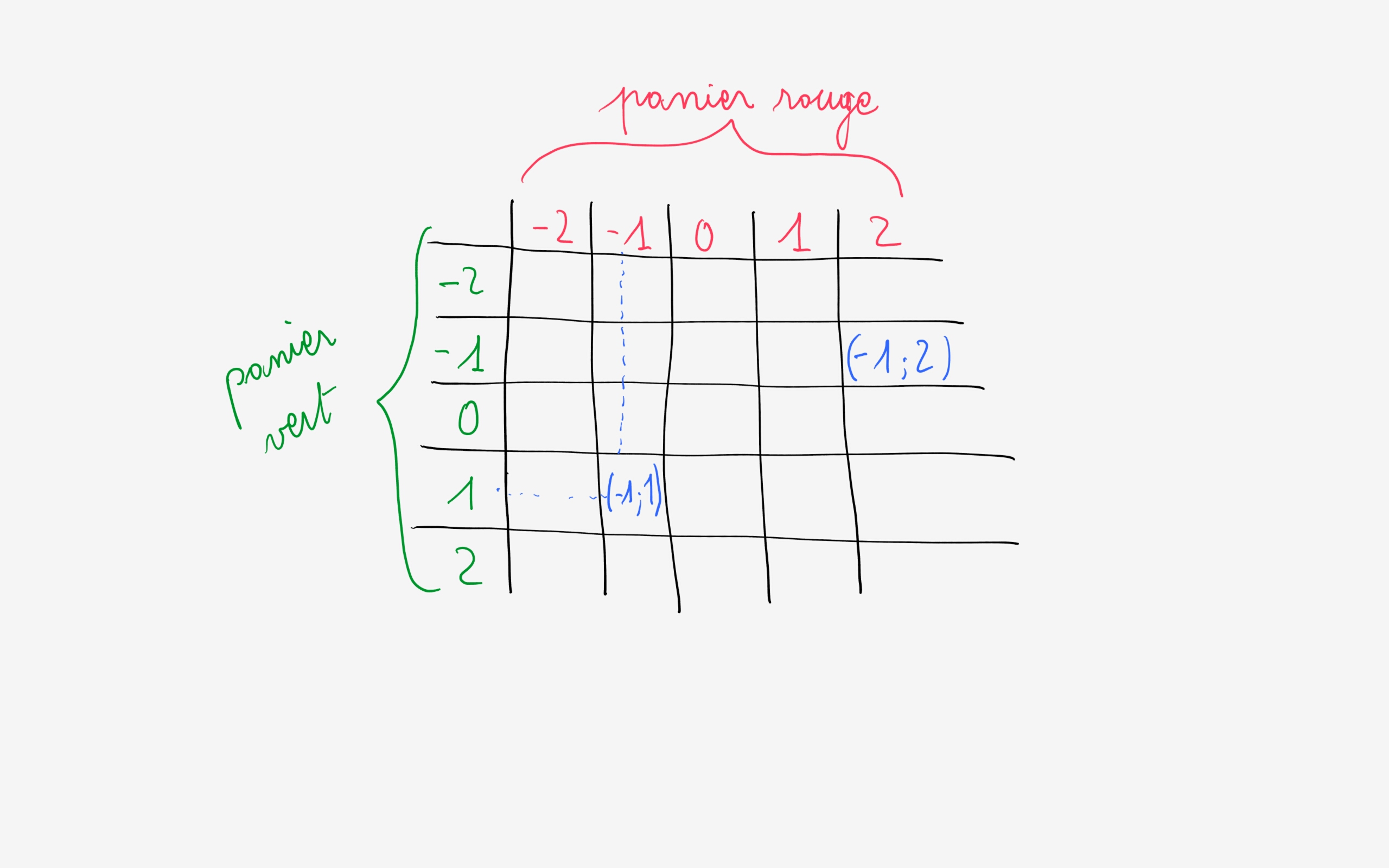 Si j'ai \((-2)\) avec la boule verte, je peux alors avoir \((-2;-2)\) ou \((-2;-1)\) ou \((-2;0)\) ou \((-2;1)\) ou \((-2;2)\)