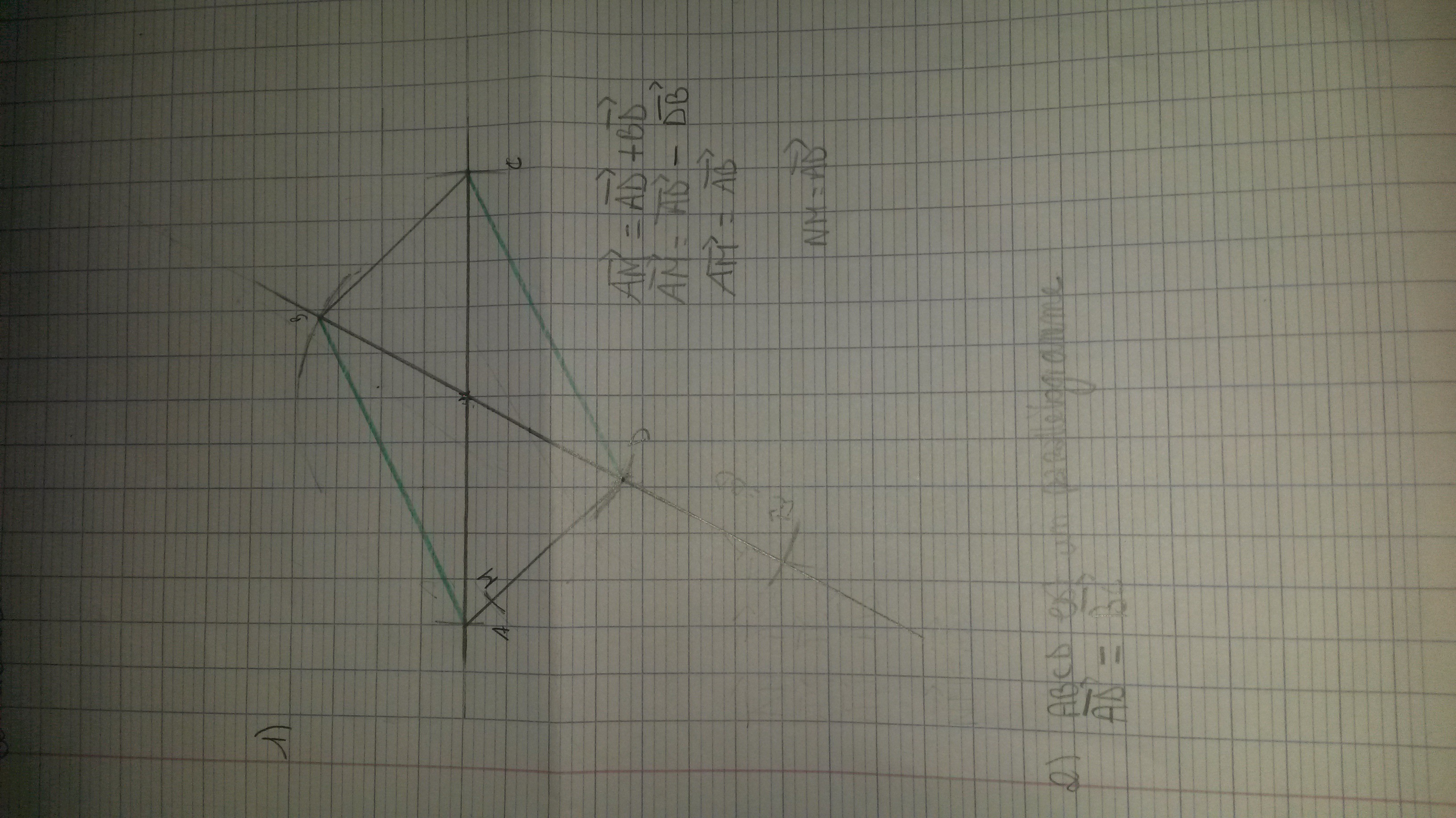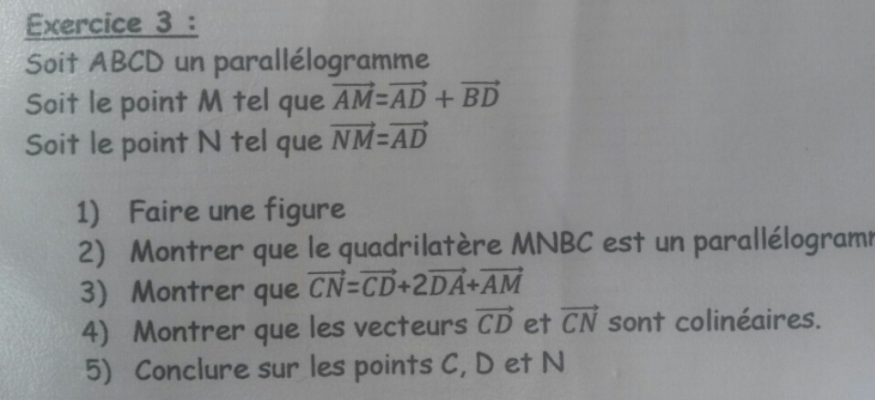 Pour démontrer ensuite, dans la question 2) c'est assez simple : comme ABCD est un parallélogramme, on sait que les vecteurs \(\vec{AD}\) et \(\vec{BC}\) sont égaux... donc...