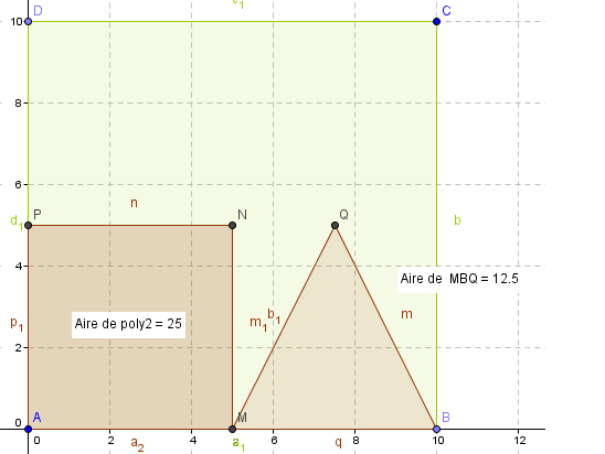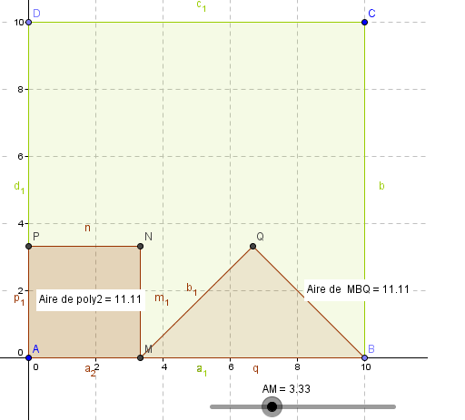 Bonjour, j'ai un DM de maths à faire ( voir sujet). J'ai compris les questions, j'ai fais ma conjecture avec Geogebra où j'ai trouvé que si AM= 3.33, les deux aires sont de 11.11 cm². Pour la validation de la conjecture cependant (question 2), les resultats ne collent pas parfaitement avec la conjecture. Pour la phase numérique j'ai utilisé excel et j'ai fais un tableur, j'y ai entré les valeurs possibles de x puis d'une part la formule x(10-x)/2 et d'autre part x². Cependant je n'obtiens pas le resultat attendu. La phase graphique dépend de mon tableur donc ceci me bloque un peu. Merci de m'éclairer.
