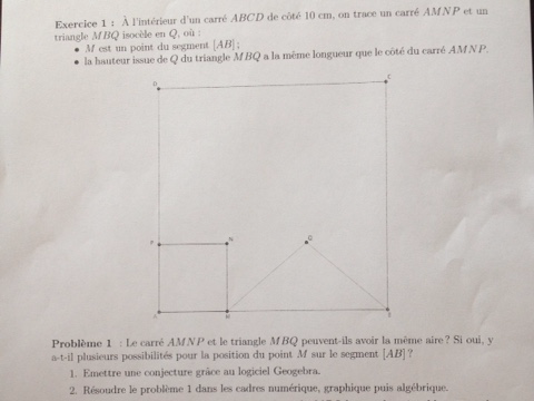 Dans le problème n°2, il faut trouver l'aire maximale du triangle avec Geogebra, pour la conjecture, d'une part, puis faire une validation graphique puis algébrique d'autre part. J'ai conjécturer que l'aire maximale du triangle est de 12.5 cm². Pour la résolution graphique, j'ai tracé la courbe avec ce logiciel (voir PJ) et pour la résolution algébrique j'immagine qu'il faut trouver la forme canonique mais je ne suis pas sur et j'ai un emploi du temps très chargé alors je préfère demander conseil pour être bien orienté. Merci à l'équipe, Juan.