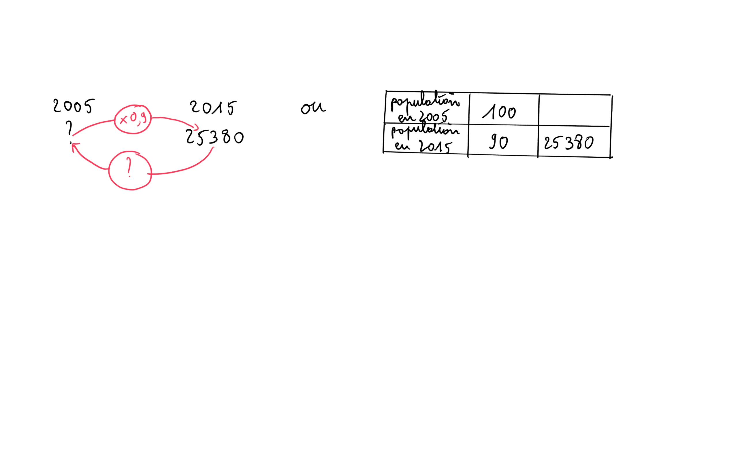 On sait qu'en 10 ans, c'est à dire de 2005 à 2015, la population a diminué de 10% : cela signifie donc que la population passe de N habitants en 2005 à (N -10% de N) en 2015.