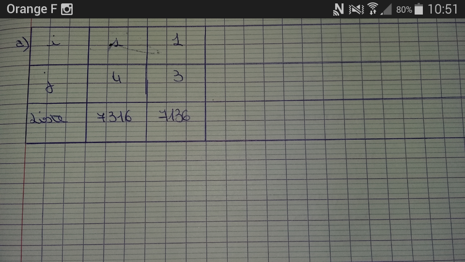 a) Faire fonctionner cet algorithme : reproduire et compléter le tableau suivant afin de suivre l'évolution des variables. On prend n=4 et la liste : 7361.