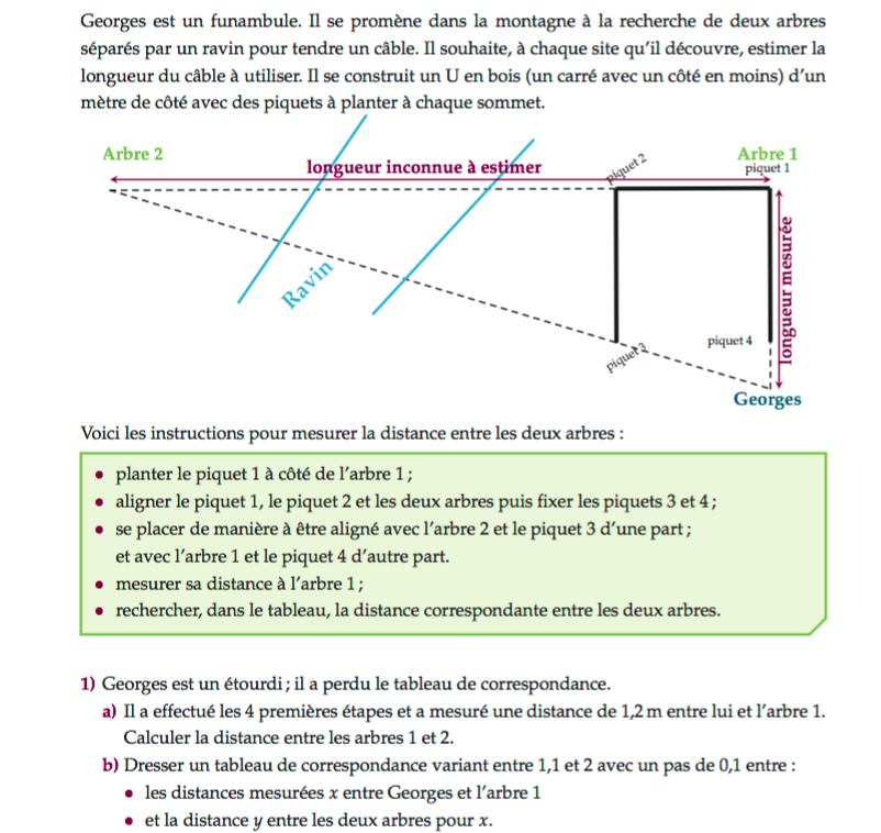 Georges est un funambule. Il se promène dans la montagne à la recherche de deux arbres séparés par un ravin pour tendre un câble. Il souhaite, à chaque site qu’il découvre, estimer la longueur du câble à utiliser. Il se construit un U en bois (un carré avec un côté en moins) d’un mètre de côté avec des piquets à planter à chaque sommet.