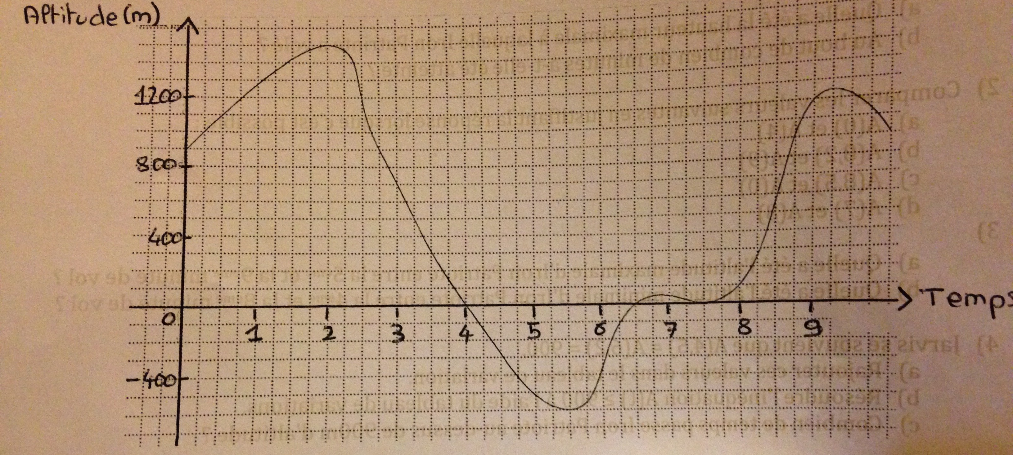 Résoudre l'inéquation \(A(t)\leqslant 0\) revient à déterminer toutes les valeurs d'abscisses pour lesquelles les points de la courbe sont situés en dessous de l'axe des abscisses : Il te reste à lire l'intervalle correspondant : la longueur de cet intervalle te donner aussi le temps qu'il a passé sous l'eau.
