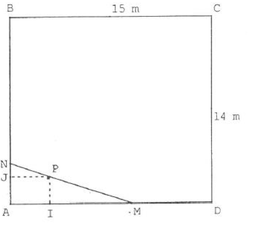 Pour construire ce stand on appuie une barrière droite [MN] sur le pilier P de manière qu'elle touche les deux murs. On s'intéresse à la surface occupée par le stand, c'est à dire à l'aire du triangle AMN.