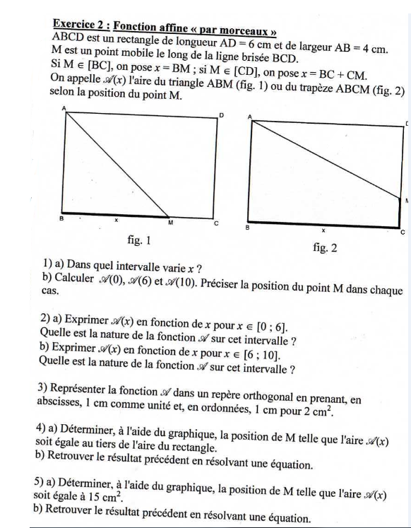 Bon , lorsque x est dans [0;6], alors M est sur le côté [BC], et A(x) est donc l'aire du triangle ABM, donc A(x)=4*x/2=2x