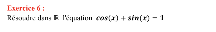 Le premier concerne la trigonométrie et consiste en résoudre l'équation trigonométrique cos(x)+sin(x)=1. J'ai trouvé une manière de trouver la réponse mais elle m'a l'air beaucoup trop complexe, et je n'arrive pas à trouver une manière plus simple. J'ai essayé en remplaçant sin(x) par cos(π/2 - x), mais je n'arrive pas à trouver la réponse en faisant cela. (-exercice 6)