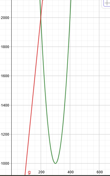 cette intersection se fait pour x=500 mais aussi pour x=200, tu peux t'aider de GeoGebra pour visualiser. Pour la question 12)