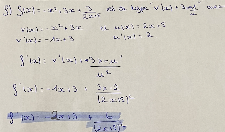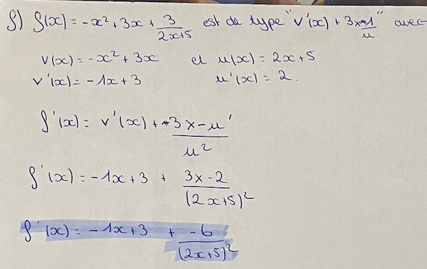 \(x\mapsto -x^2+3x\) (dérivée d'un polynôme) puis \(x\mapsto 3\times \dfrac{1}{2x+5}\) (dérivée d'une fraction de la forme \(3\times \dfrac{1}{u}\).