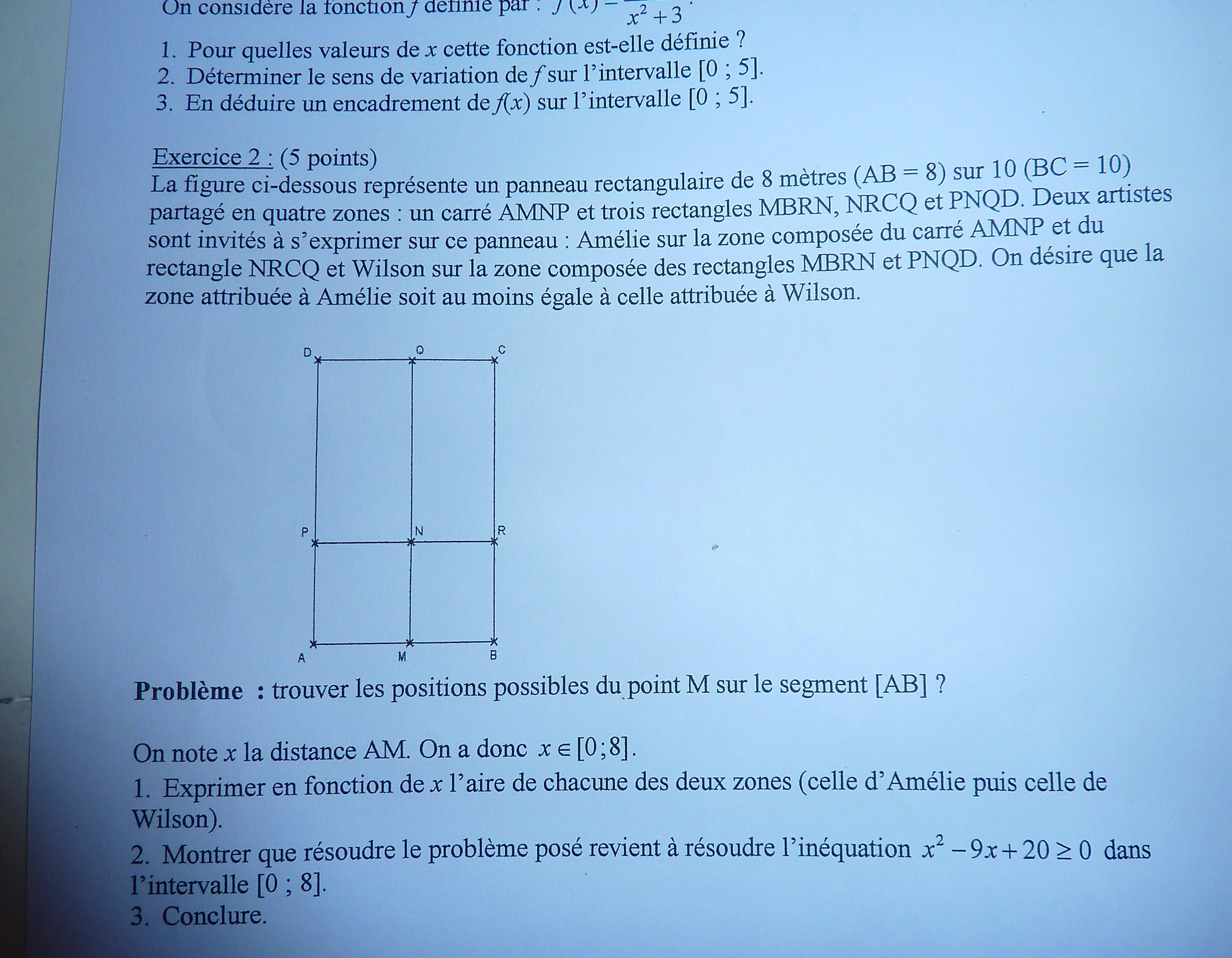 Pour la première question, tout est juste. Ensuite, d'après ce que tu as fait, tu sais que le trinôme est positif sur \(\left] -\infty ;4\right] \cup \left[ 5;+\infty \right[\) (à l'extérieur des racines). Or, de plus \(x \in [0;8]\). A toi à terminer. Pense bien, que l'on souhaite que la zone attribuée à Amélie soit AU MOINS EGALE à celle attribuée à Wilson. Bonne continuation.
