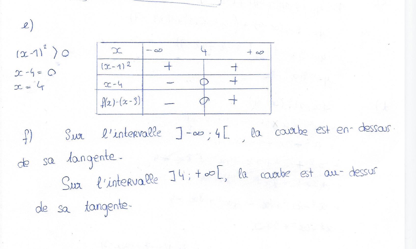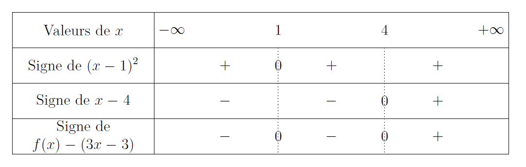 les intervalles sur laquelle \(f(x)-(3x-3)\geq 0\) : la courbe est au-dessus de sa tangente sur ces intervalles.