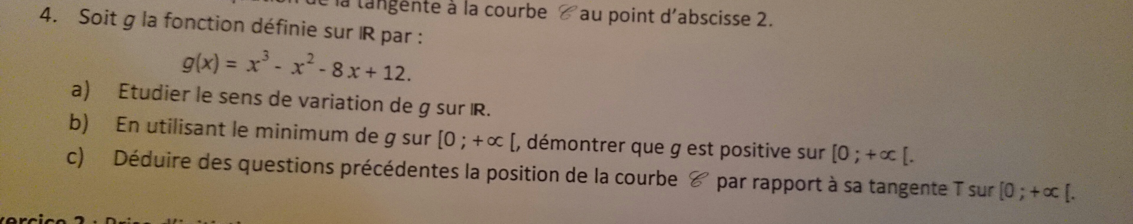 Pour l'autre exercice, il faut étudier la fonction \(g\) définie sur \(\mathbb{R}\)par \(g(x)=x^3-x^2-8x+12\) :