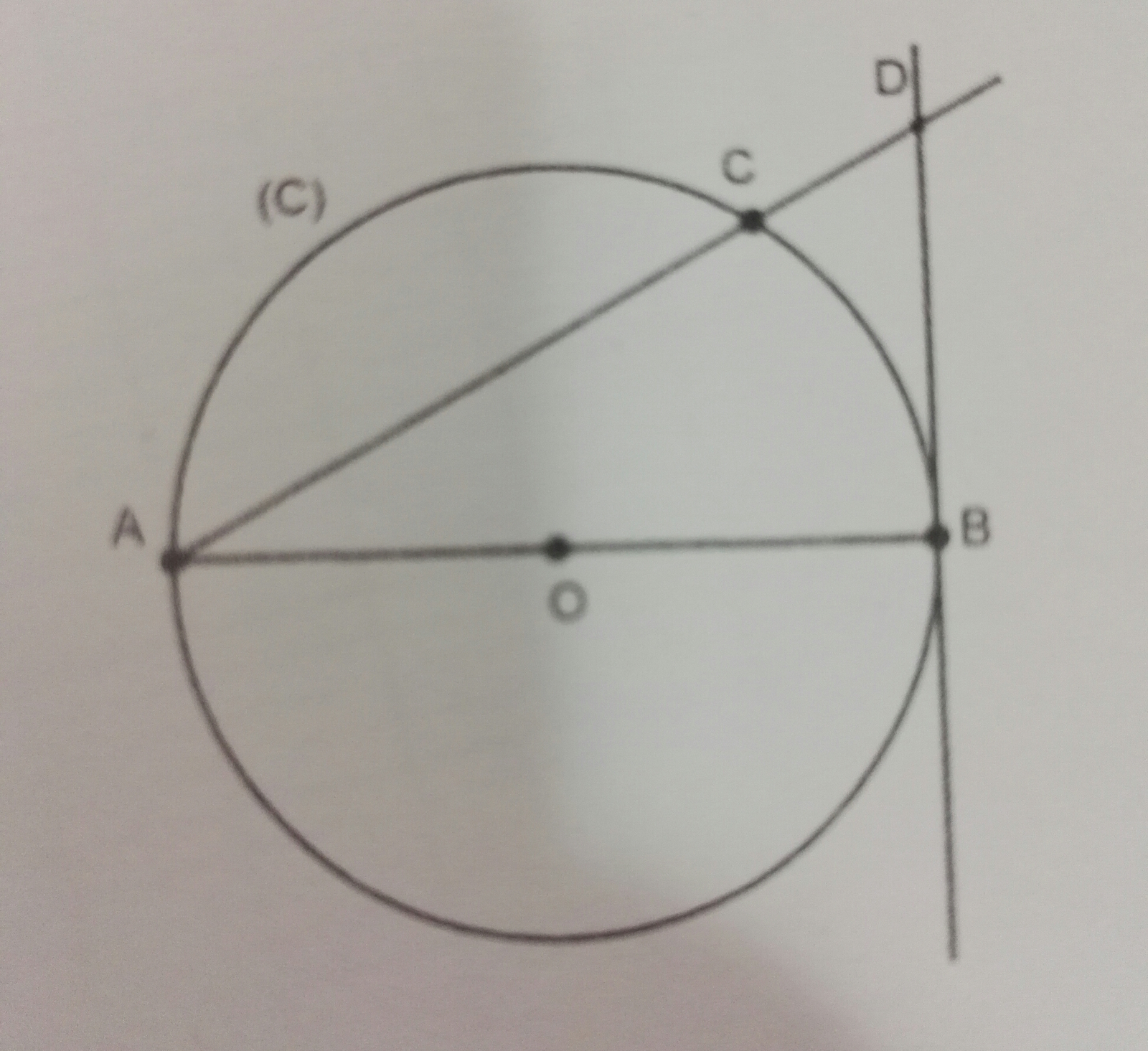 Sujet : On considère le cercle (C) ci-dessous de diamètre [AB]. C est un point du cercle et D est l'intersection de (AC) et de la tangente à (C) en B. Démontrer que AC. AD = AB²