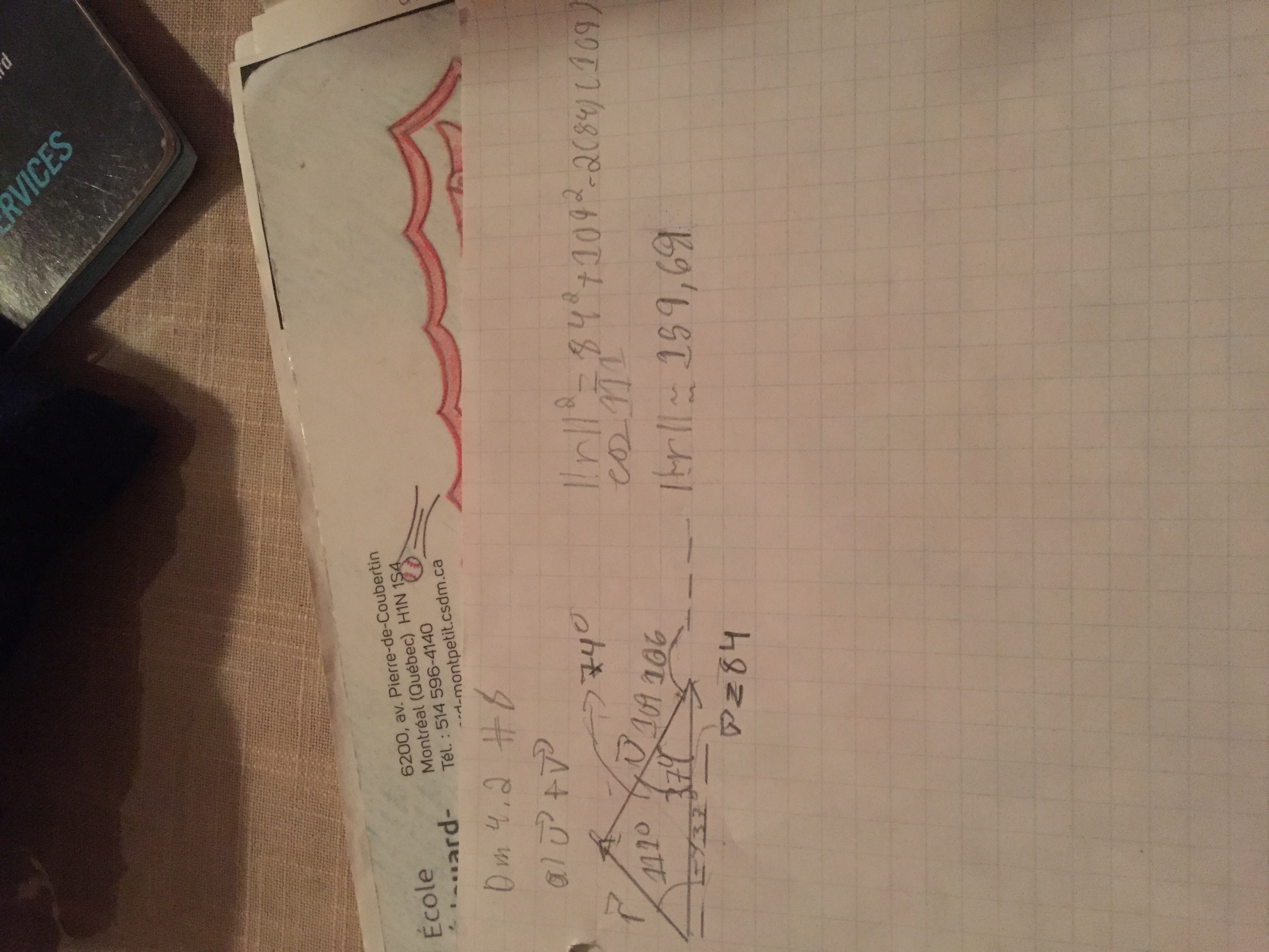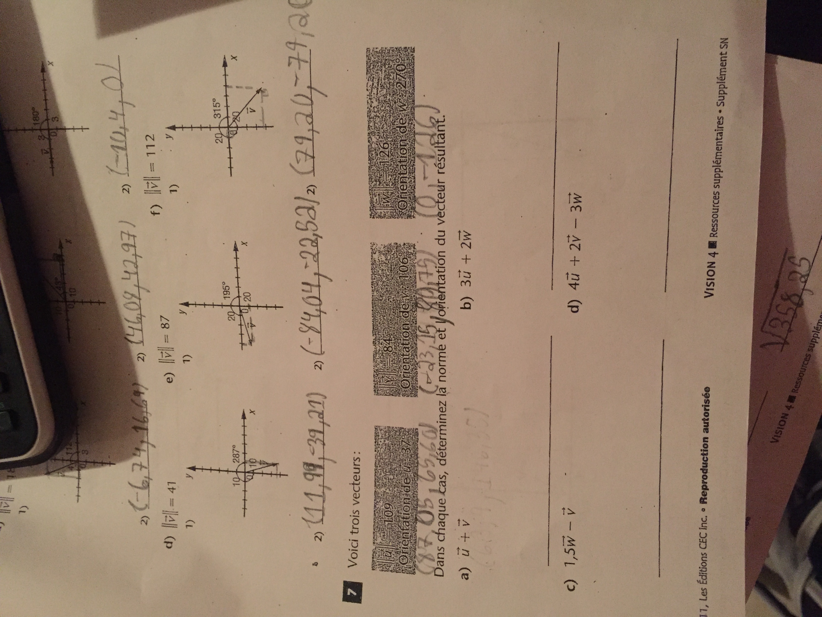 Si vous voyez mal premier recteur norme de u =109 et l’orien 37 degré, deuxième rectangle norme de v=84 et l’orien 106 degré et troisième carré norme de w=126 et l’orien270 degré.