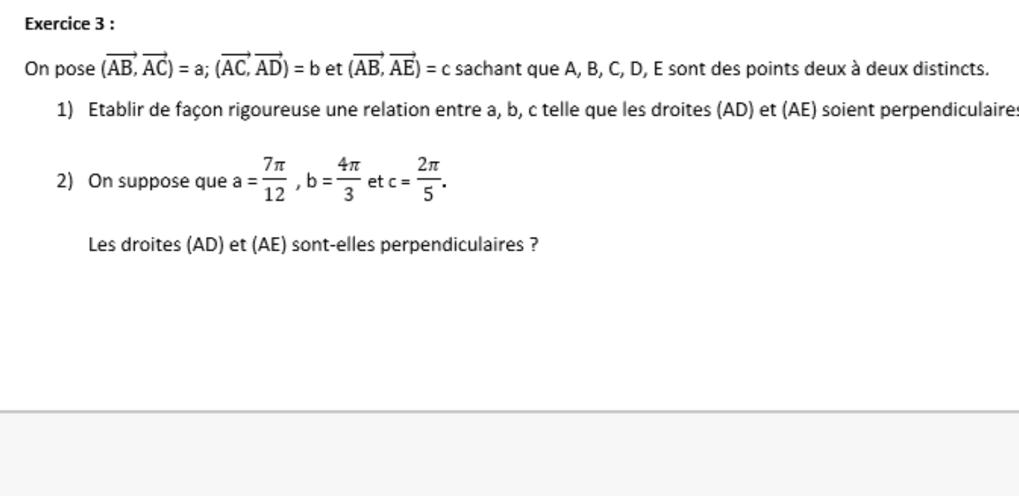 Par addition tu as : \((\overrightarrow{AD},\overrightarrow{AE}) = (\overrightarrow{AD},\overrightarrow{AC}) + (\overrightarrow{AC},\overrightarrow{AB})+(\overrightarrow{AB},\overrightarrow{AE})\)