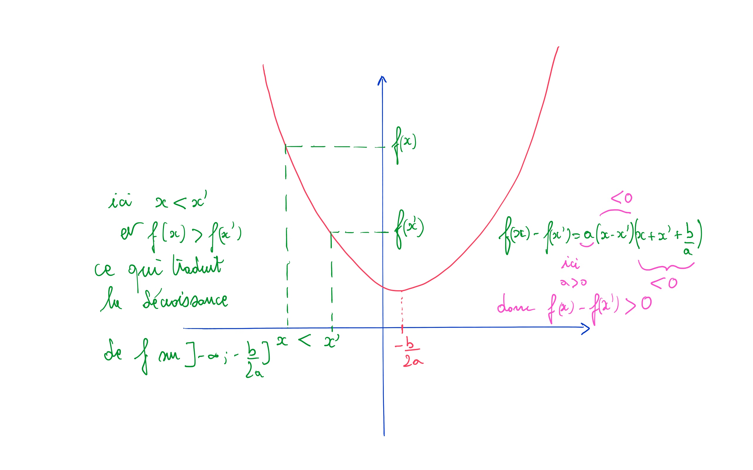 si \(a<0\) alors \(f(x')-f(x)<0\) et la fonction est décroissante : logique pour une parabole orientée vers le haut car \(a>0\), (on est "à gauche" du sommet) ;