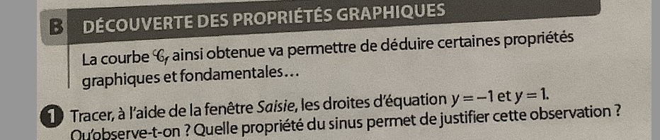Pour la question 1, cela rejoint ce que j'ai déjà dit : ta courbe est "coincée" entre ces deux droites, ce qui traduit le fait que le sinus d'un réel est toujours compris entre -1 et 1 : on l'a vu sur le cercle, le point N se déplaçait dans l'intervalle [-1;1].