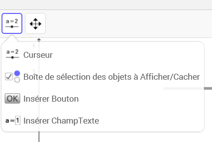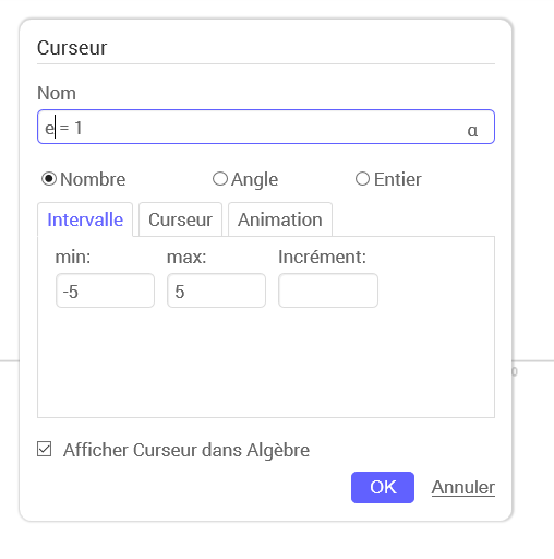 dans le menu il y a un bouton "curseur", tu cliques dessus et une nouvelle fenêtre va s'ouvrir où tu donnera le nom "e" à ton curseur et où tu donneras le minimum -5 et le maximum 5.