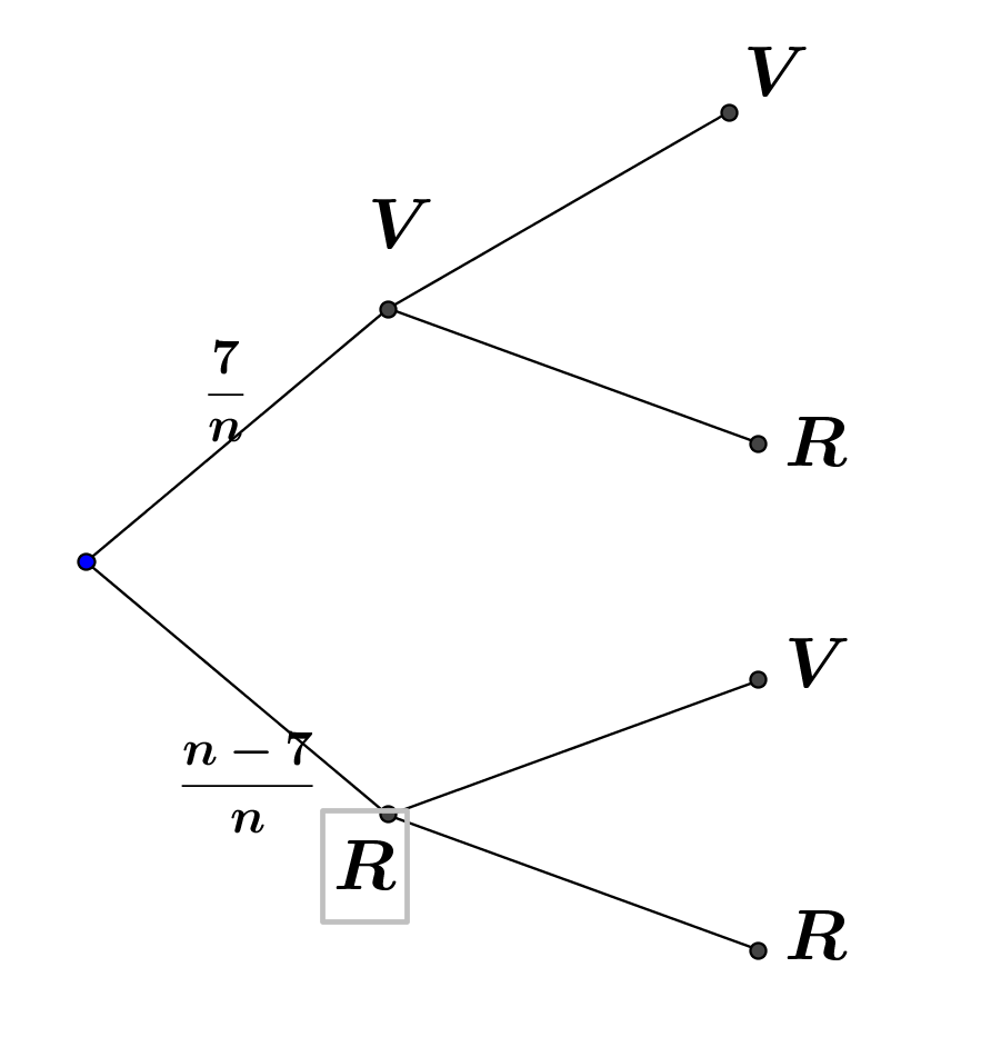 De même si tu as tiré un rouge au premier tirage, tu es sur la branche R en bas) ton urne contient 9 jetons dont toujours 7 verts et 2 rouges. A toi de corriger cette partie de l'arbre.