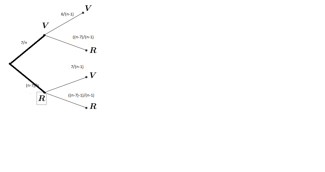 Si tu as une urne avec 7 jetons verts et 3 jetons rouges. Tu tires un premier jeton tu as \(\frac{7}{10}\) pour la branche V et \(\frac{3}{10}\) pour la branche R.