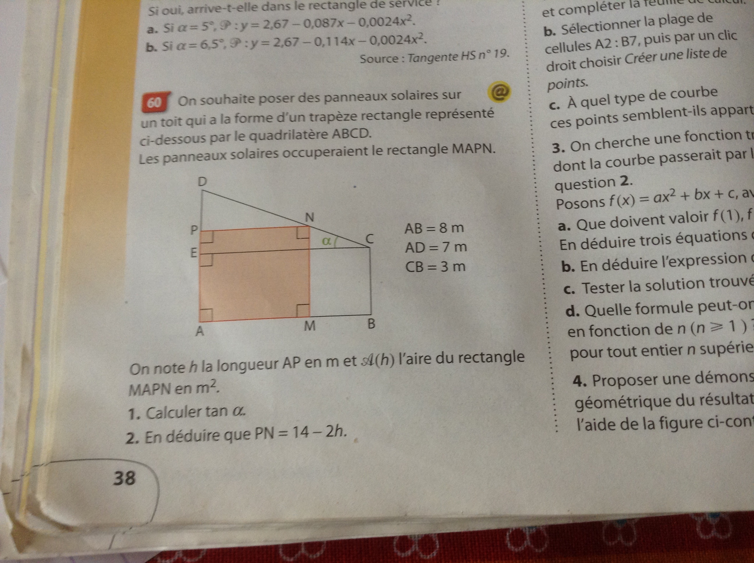 Oui j'y ai répondu et j'ai trouver tan alpha :1/2 (opposé /adjascant 4/8)