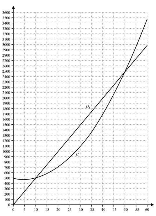 Les deux courbes se rencontrent aux points (10,50) et (50,2500).