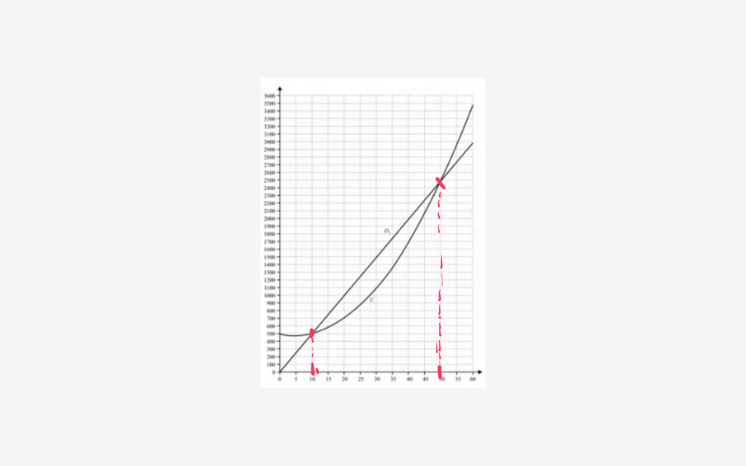 Tu sais juste que quand \(x\in[10\,;\,50]\), \(R(x)\geq C(x)\).