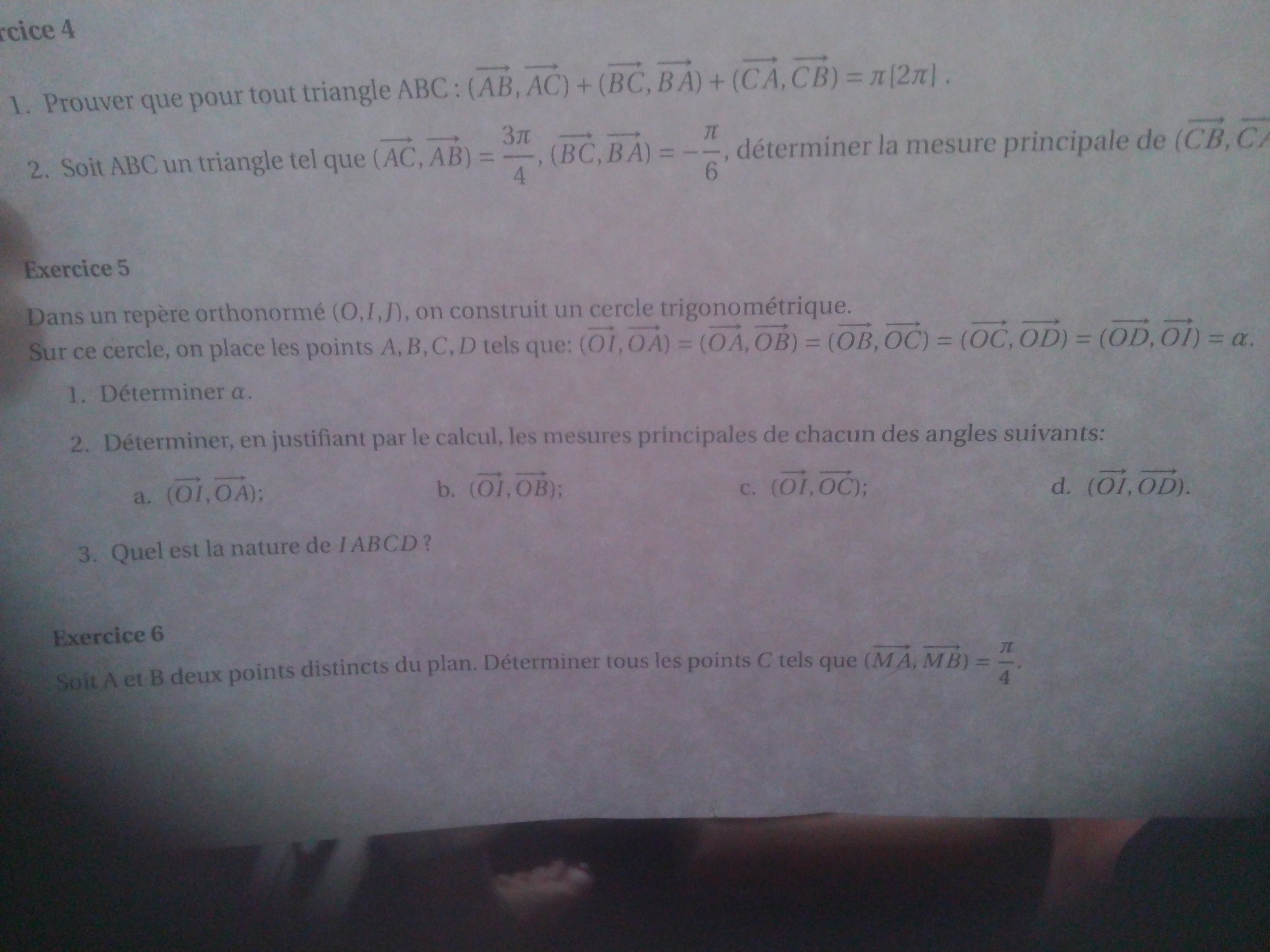 Tes exercices sont des exercices sur les angles orientés. Il te faut donc connaître et savoir appliquer les propriétés sur les angles orientés : Relation de Chasles ; Relation entre \(\widehat{(\vec{u};\vec{v})}\) et \(\widehat{(-\vec{u};-\vec{v})}\) etc .....