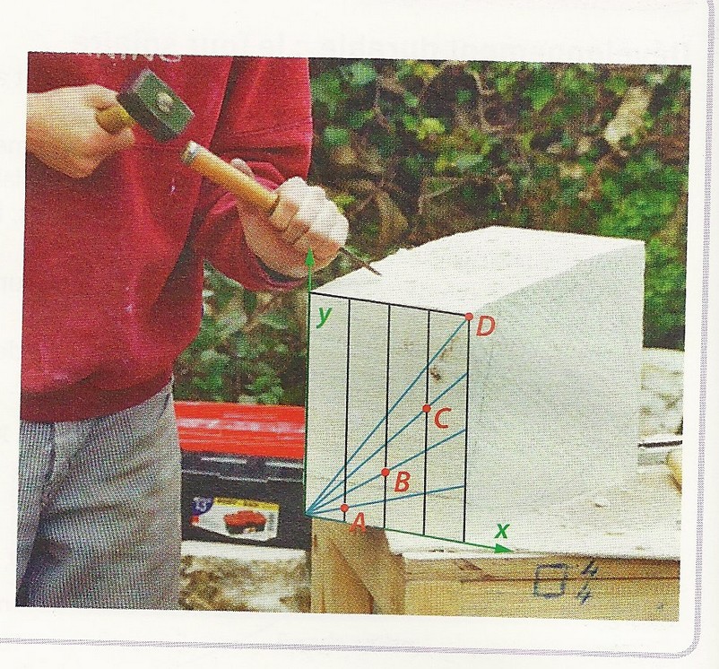 J'ai déjà trouver que la largeur de la pierre est égale à 1, les barres noires qui sont verticales divisent cette unité en quarts. O est donc situé à x = 0, A = 1/4, B= 1/2, C = 3/4, D=1. Or, à partir d'ici je suis bloquée, je ne sais pas quoi faire pour prouver que les points appartiennent à la parabole.
