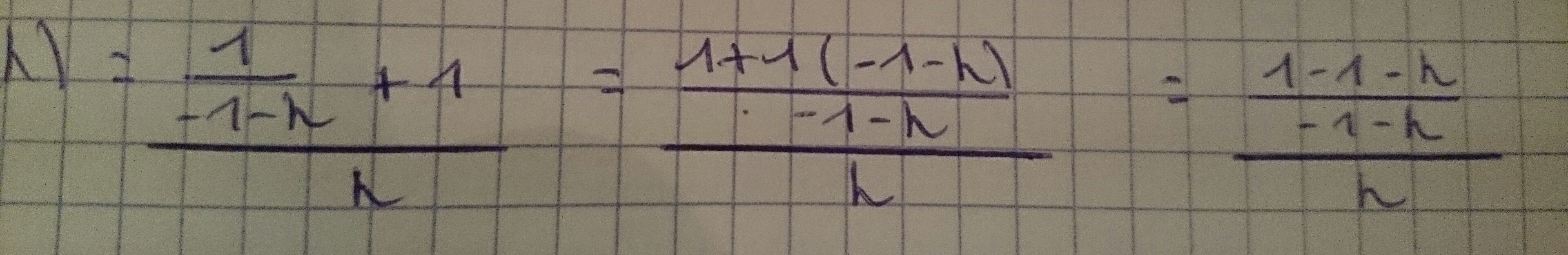 Je n'arrive pas à savoir ce que représente tes fractions 1+1(-1-h)/-1-h est-ce \(\frac{1+1(-1-h)}{-1-h}\) ou \(1+1\frac{-1-h}{-1-h}\) ou autre ?