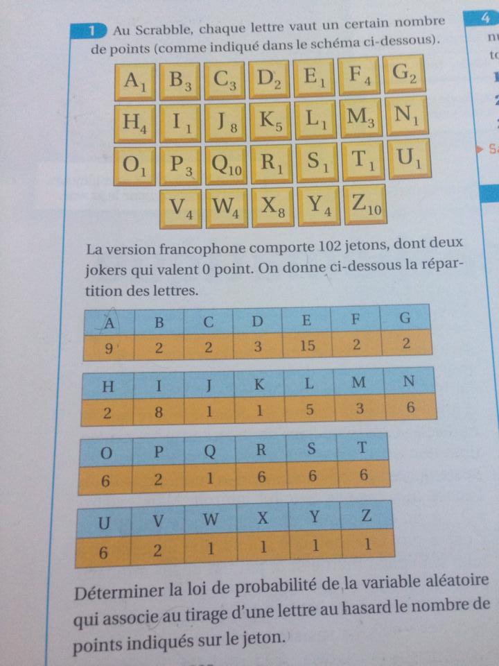Puis si tu définis X comme la "fonction" (variable aléatoire en fait) qui à chaque tirage de lettre associe le nombre de points associé, alors par exemple, l'événement (X=0) est réalisé lorsque on tire un des deux jokers : il y en a 2 sur 102 donc \(p(X=0)....\)