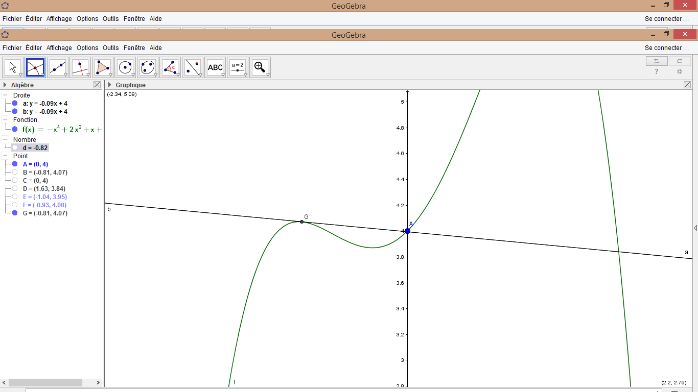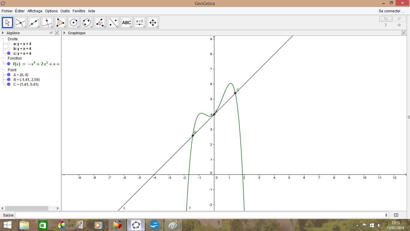 J'ai trouvé deux autres point B et C d'intersections entre la fonction f et la tangente mais je n'arrive pas à trouver les coordonnées de ces deux points par le calcul