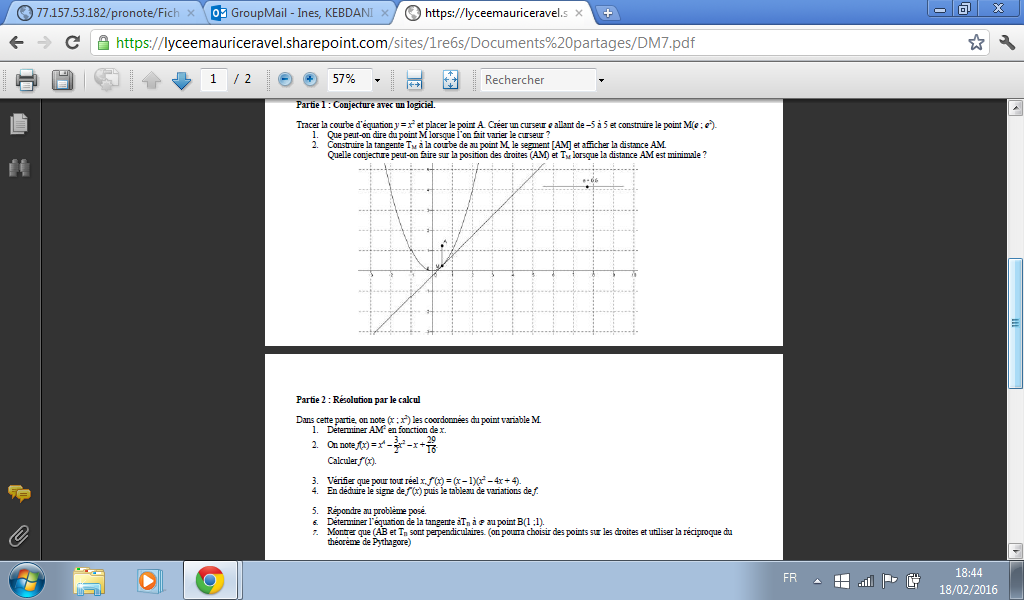 Alors en construisant mon tableau de signe je trouve que c'est de -infini à -1/2 puis négatif encore de -1/2 à 1 et positif de 1 à +infini. Donc f est décroissante de -infini à 1 puis croissante de 1 à +infini . 1 atteint un minimum en racine de 5/4. Alors la position du point de la parabole le plus proche de A est racine de 5/4.