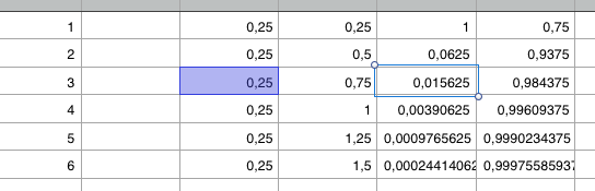 je te rappelle que le produit de deux fractions se calcule ainsi : \(\frac{1}{2}\times \frac{1}{4}=\frac{1\times 1}{2\times 4}=\frac{1}{8}\)