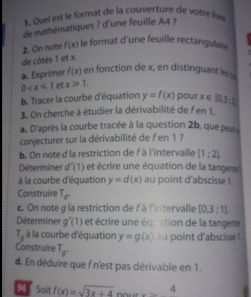 Est cela ? Par rapport à la question 3)b) qui est je le rapelle : On note d la restriction de f à l'intervalle [1 ; 2]. Déterminer d ' (1) et écrire une équation de la tangente à la courbe d'équation y = d(x) au point d'abscisse 1 ? Contruisez Td.