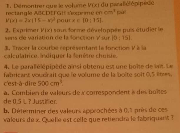 Et tout ça à partir de \(V(x)=2(15-x)(15-x)\times x\)