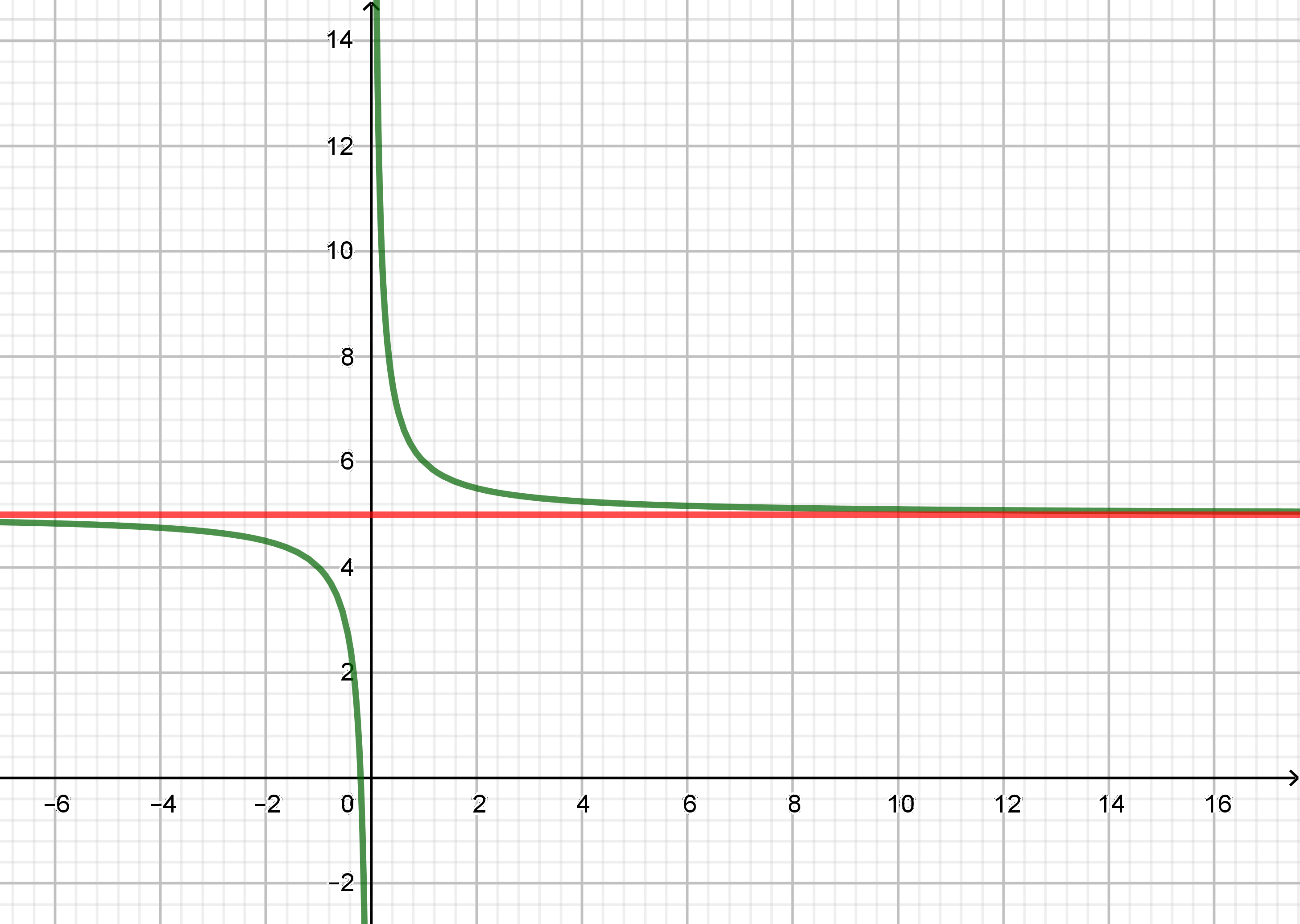 La droite rouge est une asymptote horizontale d'équation y=5 pour la courbe verte.