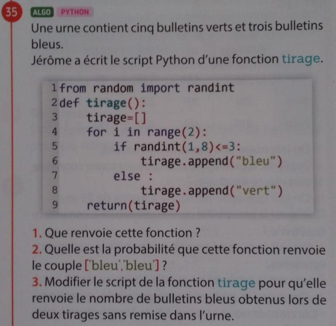 Pour la question 2 j'ai fait un arbre pondéré qui indique qu'au premier tirage la probabilité d'avoir un bulletin bleu est de 3sur8 et au deuxième tirage 2sur7 donc la probabilité de trier deux bulletins bleus est de 3sur8 × 2sur7 = 3sur28 Pour la 3ème question je n'ai pas compris